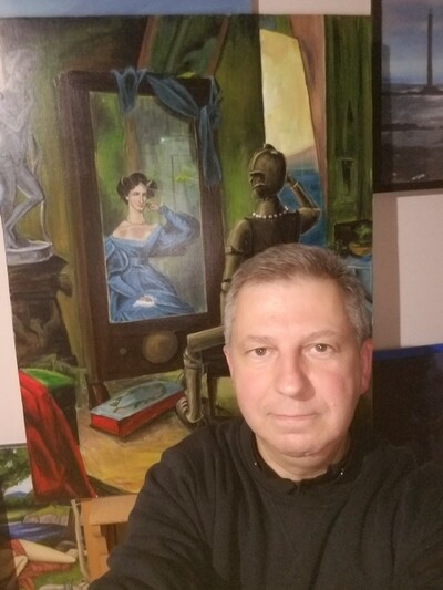 Je fais quelques expos de temps en temps. Je réponds assez vite -!- aux différentes commandes : Icônes sur bois à la tempéra à l'oeuf, reproduction d'oeuvres anciennes, peintures de paysage, natures silencieuses, créations plus abstraites, etc.